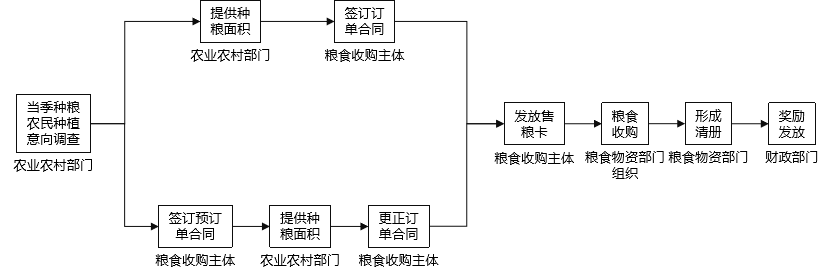 粮食物资部门组织做好粮食收购工作,制定订单分配原则并对粮食收购主体执行情况进行监督,确保订单合同落实到户,并向财政部门提供清册数据。