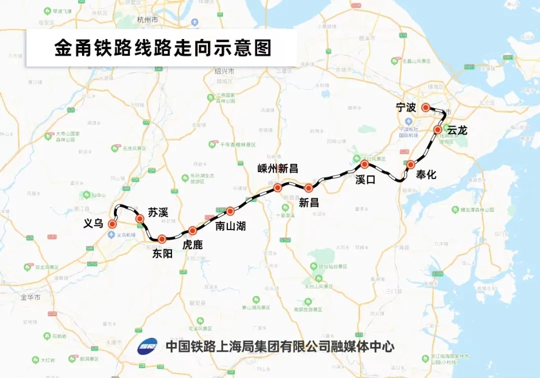 金甬铁路东起甬台温铁路云龙站,途经宁波市、绍兴市,向西终至沪昆铁路金华市义乌站,新建正线全长约188.3公里,设计时速160公里,预留200公里时速条件,为双线客货共线的Ⅰ级电气化铁路。全线于2019年10月开工建设,计划建设工期为4年。