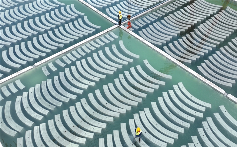 德清县舞阳街道下柏村绿色建筑工业化产业园,工人近日正在吊运地铁管片。作为浙北地区最大规模绿色市政交通工程综合产业基地,该产业园利用废弃矿山建设而成,主要生产装配式交通市政预制构件、地铁管片、地下管廊预制构件等新型材料。
